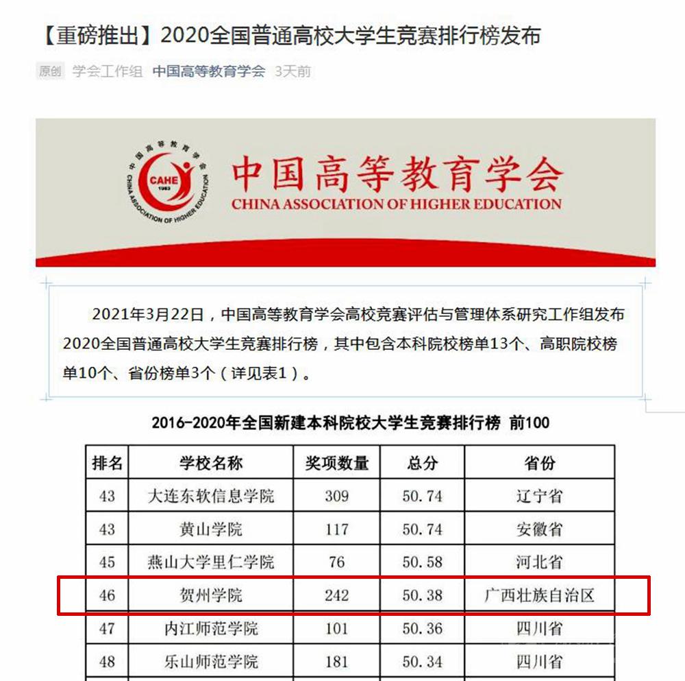 近日,中国高等教育学会高校竞赛评估与管理体系研究工作组发布2020全国普通高校大学生竞赛排行榜,我校在2016-2020年全国新建本科院校大学生竞赛排行榜前100中排名第46位,在广西5所同类高校中排行第二。