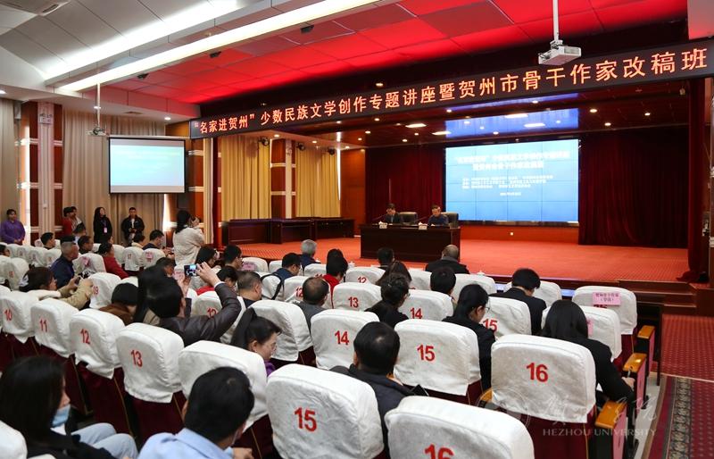 本次活动由中国作家协会《民族文学》杂志社、贺州市委宣传部主办,贺州文学艺术界联合会、我校文化与传媒学院承办,旨在进一步繁荣贺州文学事业,营造浓厚的文学创作氛围,扶持培育文学新人,提升贺州市文学创作水平。贺州市委宣传部、贺州市文联、贺州骨干作家(学员)及我校师生代表等200多人到场聆听。
