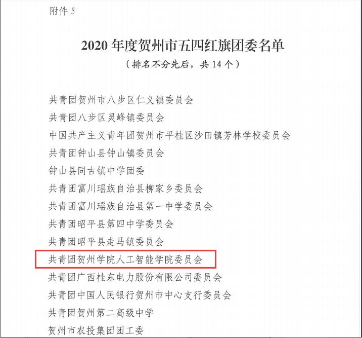 近日,共青团贺州市委员会发布了《关于表扬2020年度贺州市共青团系统优秀个人和优秀集体的决定》,我校人工智能学院团委荣获“贺州市五四红旗团委”称号。