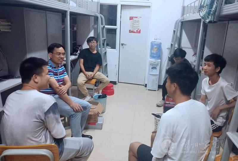 6月16日晚,学校副校长蒋红星走访联系单位、应用技术学院学生宿舍,与学生谈心交流,应用技术学院领导班子随同走访。