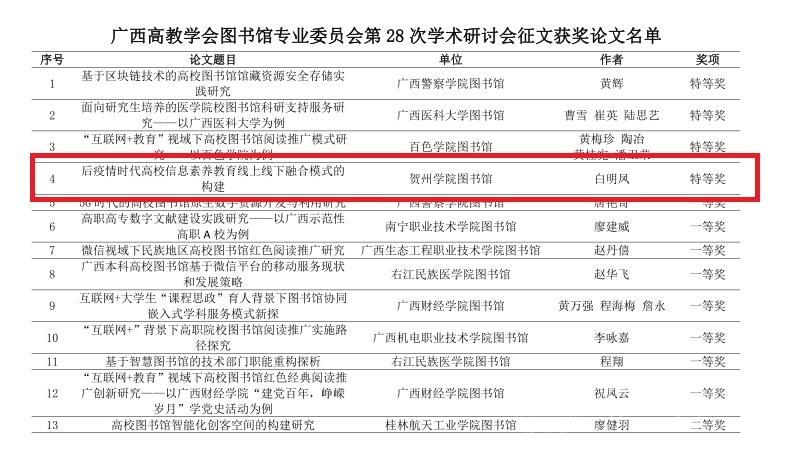 近日,广西高教学会图书馆专业委员会第28次学术研讨会征文的评选结果揭晓,我校图书馆白明凤副教授撰写的论文《后疫情时代高校信息素养教育线上线下融合模式的构建》荣获特等奖。