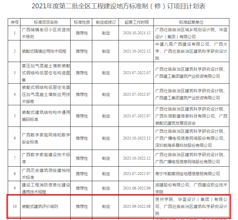 近日,根据自治区住房和城乡建设厅公布2021年工程建设地方标准制(修)订项目征集结果,经组织项目申报、材料符合性审查、专家评估论证及立项答辩等环节,由我校建筑与电气工程学院牵头,联合华蓝设计(集团)有限公司、广西壮族自治区建筑科学研究设计院申报的《装配式建筑评价细则》被批准列入2021年度第二批全区工程建设地方标准制(修)订项目,全区共19个项目获批列入。
