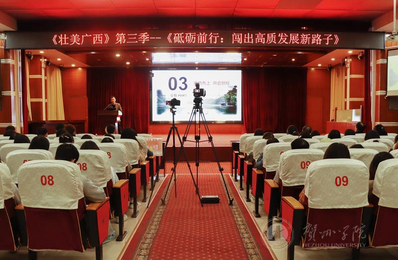 11月30日晚,我校特色思政课《壮美广西》第三季第三专题《砥砺前行,闯出高质量发展新路子》在行政楼二楼多功能厅开讲。由学校校长吴郭泉的教学团队进行授课,分为“牢记嘱托,开启新征程”“发挥优势,开拓先锋路”“深化改革,开创新局面”上中下三个篇章,引导广大师生牢记习近平总书记嘱托,锐意进取、奋发有为,凝心聚力为建设新时代中国特色社会主义壮美广西贡献力量。
