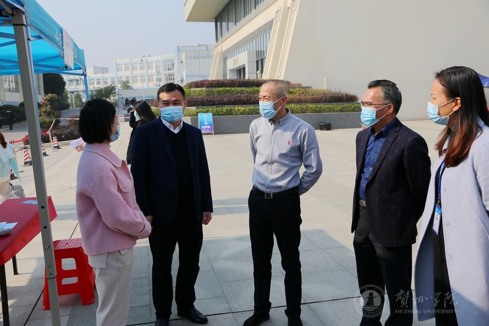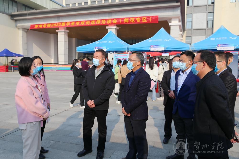 学校领导梁丁丁、吴郭泉、毛芳才、蒋红星,贺州市人力资源和社会保障局局长陈贤文出席洽谈会、走访用人单位招聘点,详细了解用人单位岗位设置、用人需求及招聘情况等,并与相关负责人进行交流,推介我校毕业生,同时鼓励现场的毕业生增强自信、积极应聘。