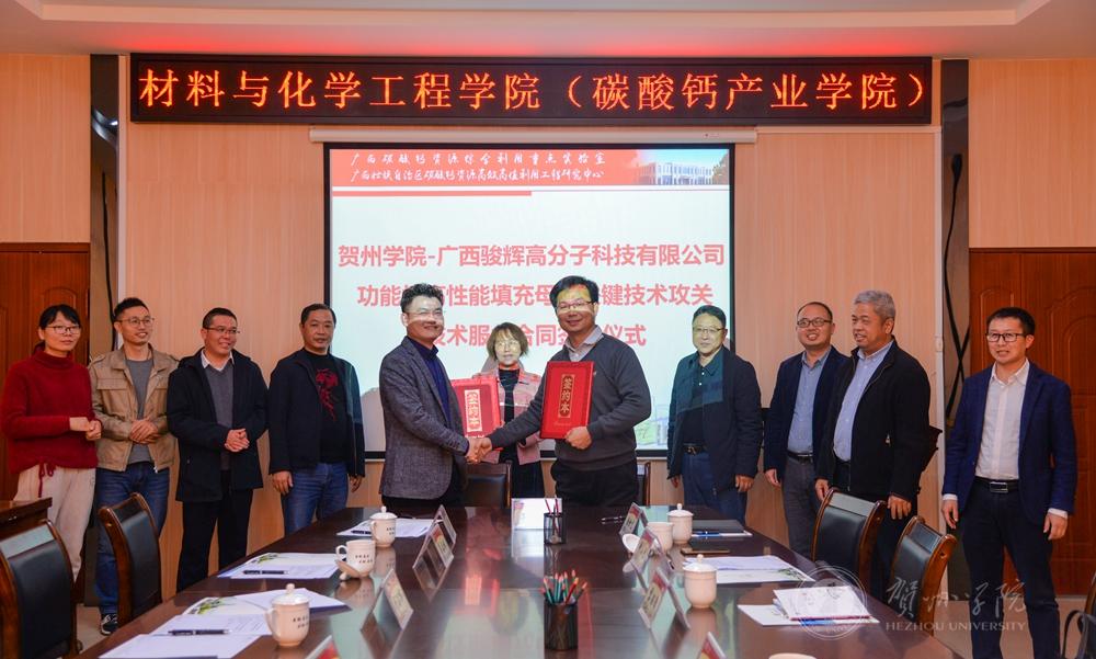 12月16日下午,我校材料与化学工程学院李鹏博士作为项目负责人,与广西骏辉高分子科技有限公司总经理方双辉在求真楼会议室签订了总金额100万元的技术服务合同。贺州市科学技术局局长杨兴徐、我校副校长黎琼锋出席见证。