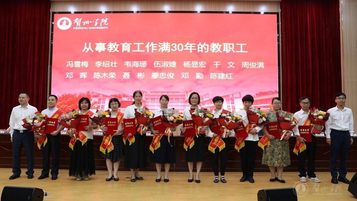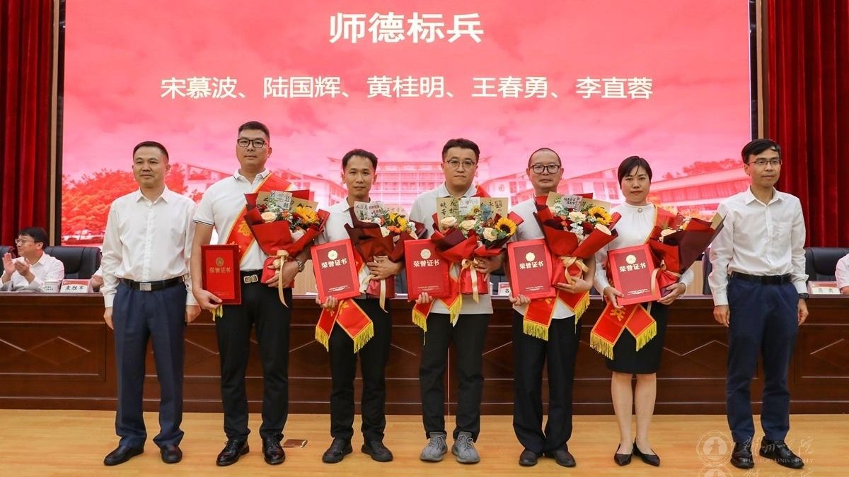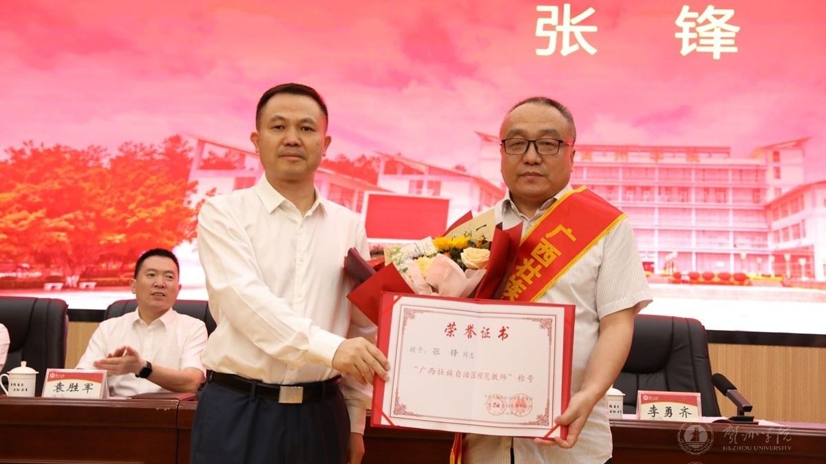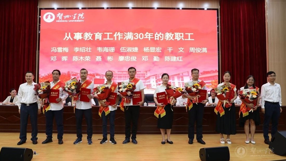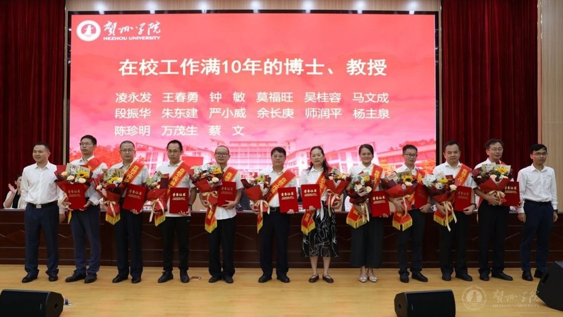 李勇齐、吕海波为荣获“广西壮族自治区模范教师”,贺州学院2025年“师德标兵”“优秀教师”“优秀教育工作者”,以及在校工作满10周年的博士或教授、教育战线工作满30年的教职工进行表彰或颁发荣誉证书,并向他们致以崇高敬意,希望他们秉持初心,在加快建成特色鲜明的高水平应用型大学新征程中再创佳绩。