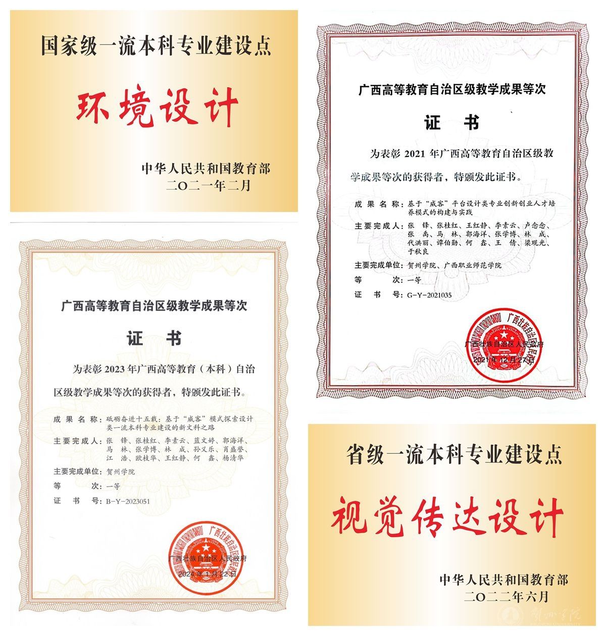 环境设计专业2020年获批国家一流本科专业建设点,为该专业广西首个获得的国家一流本科专业;视觉传达设计专业2021年入选省级本科一流专业。《威客与设计》被认定为自治区级社会实践类一流课程。2021年,《基于“威客”平台设计类专业创新创业人才培养模式的构建与实践》荣获广西高等教育教学成果奖一等奖。2023年,《砥砺奋进十五载:基于“威客”模式探索设计类一流本科专业建设的新文科之路》荣获广西高等教育教学成果一等奖。环境设计专业入选艾瑞深2022校友会中国大学专业排名(应用型)6★专业,软科2025中国大学专业排名中,环境设计专业位列B+层次。