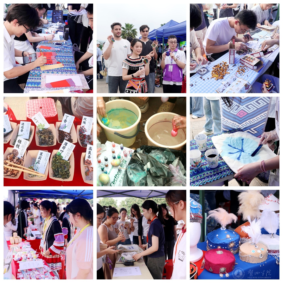 此外,教师教育学院的板鞋竞速、食品与生物工程学院的艾草锤制作、人工智能学院的拼豆手工、旅游与体育健康学院的扎染体验、马克思主义学院的五色糯米饭品鉴、设计学院的剪纸与刺绣、建筑与电气工程学院的打油茶制作、材料与化学工程学院的鼓楼积木拼搭与香囊制作等项目,纷纷吸引师生驻足体验。现场还设有踢毽子、套圈、抛绣球、筷子夹弹珠、竹竿舞等传统民俗游戏,师生们在欢声笑语中感受民族文化的浓郁韵味。