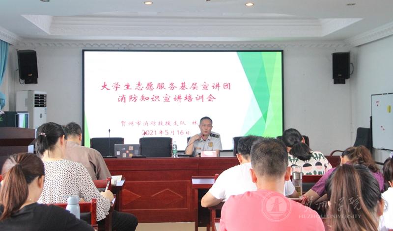 5月16日下午,贺州市消防支队防火监督科科长林必伟应邀到马克思主义学院作宣讲,为大学生志愿服务基层宣讲团成员进行消防知识宣讲培训。学院党总支书记廖玉梅、院长吕途,宣讲团指导老师和学生志愿者参加。