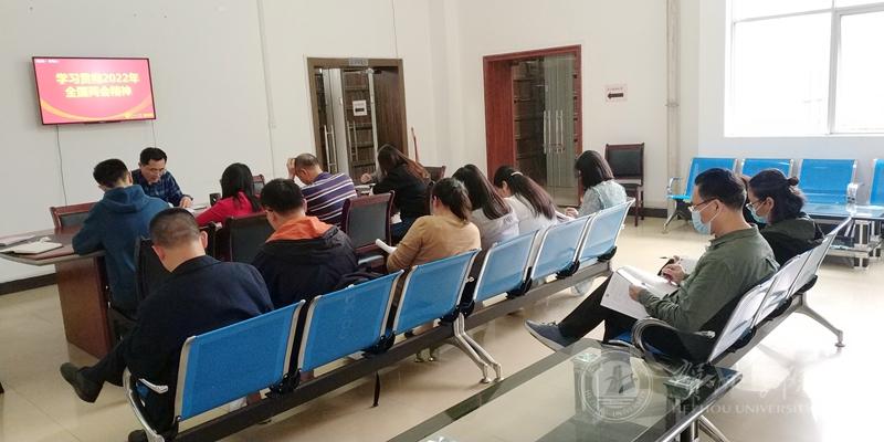 3月16日下午,图书馆党支部召开学习贯彻2022年全国两会精神会议。会议由图书馆党支部书记张百顺主持,支部全体党员参加。
