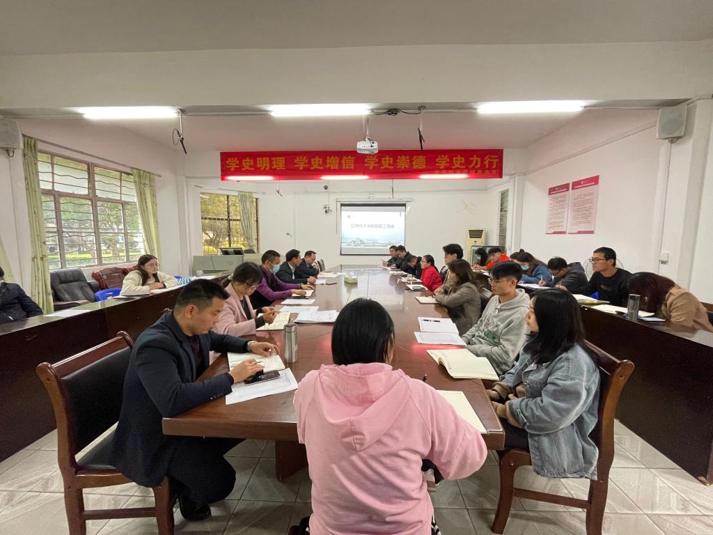 4月19日下午,应用技术学院召开全体教职工大会。学院院长莫达隆作工作报告,党总支书记肖盛誉讲话。