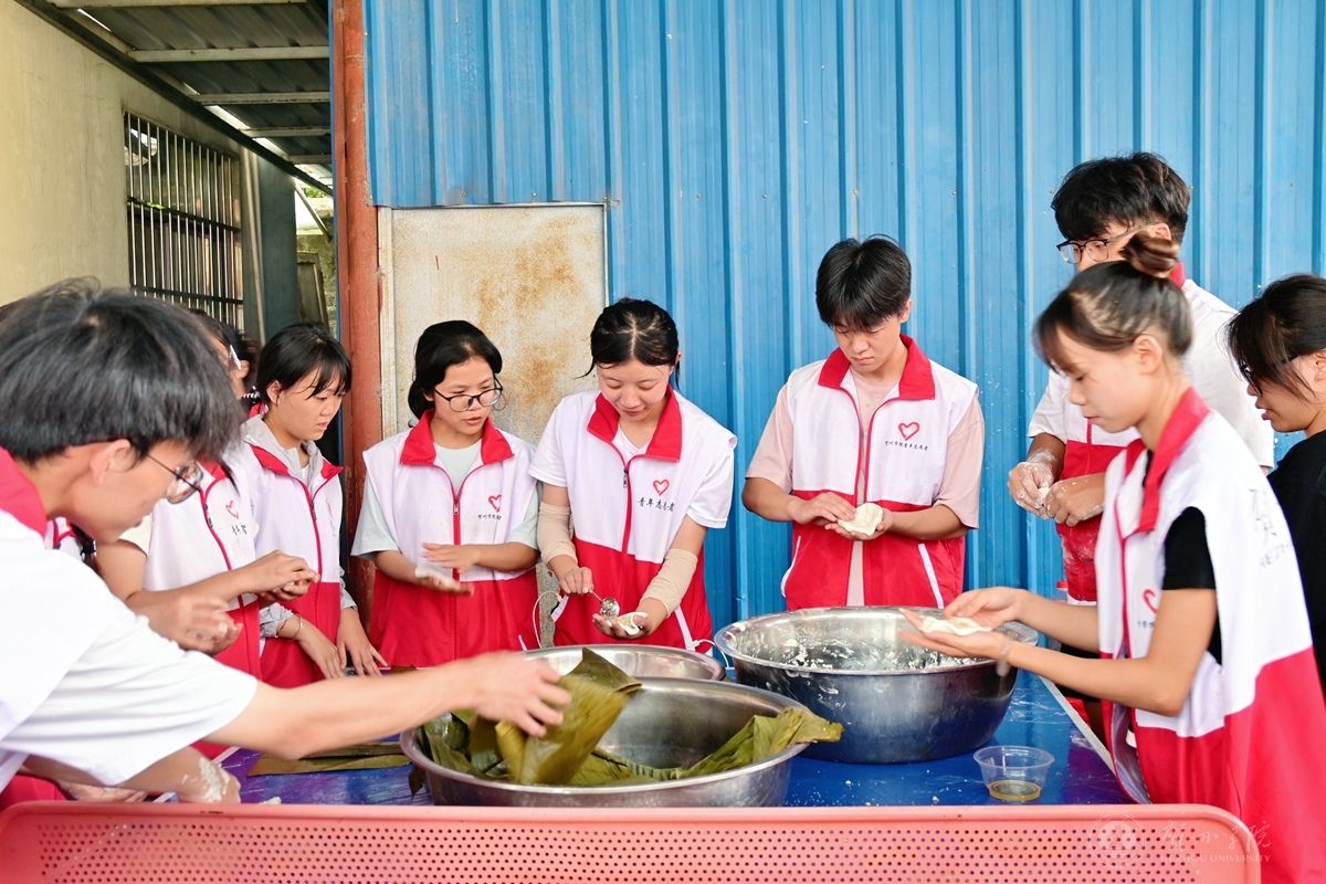图为我校学生在学习做当地的糍粑