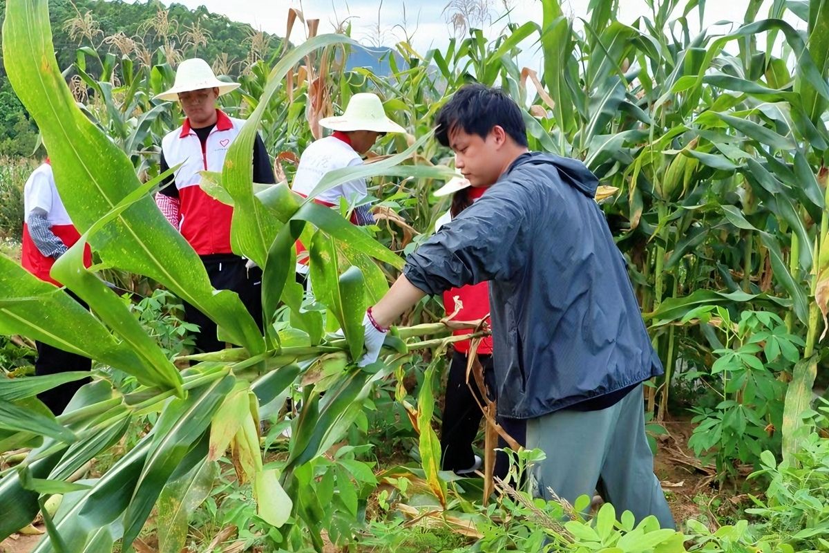 图为我校师生在帮助村民收玉米