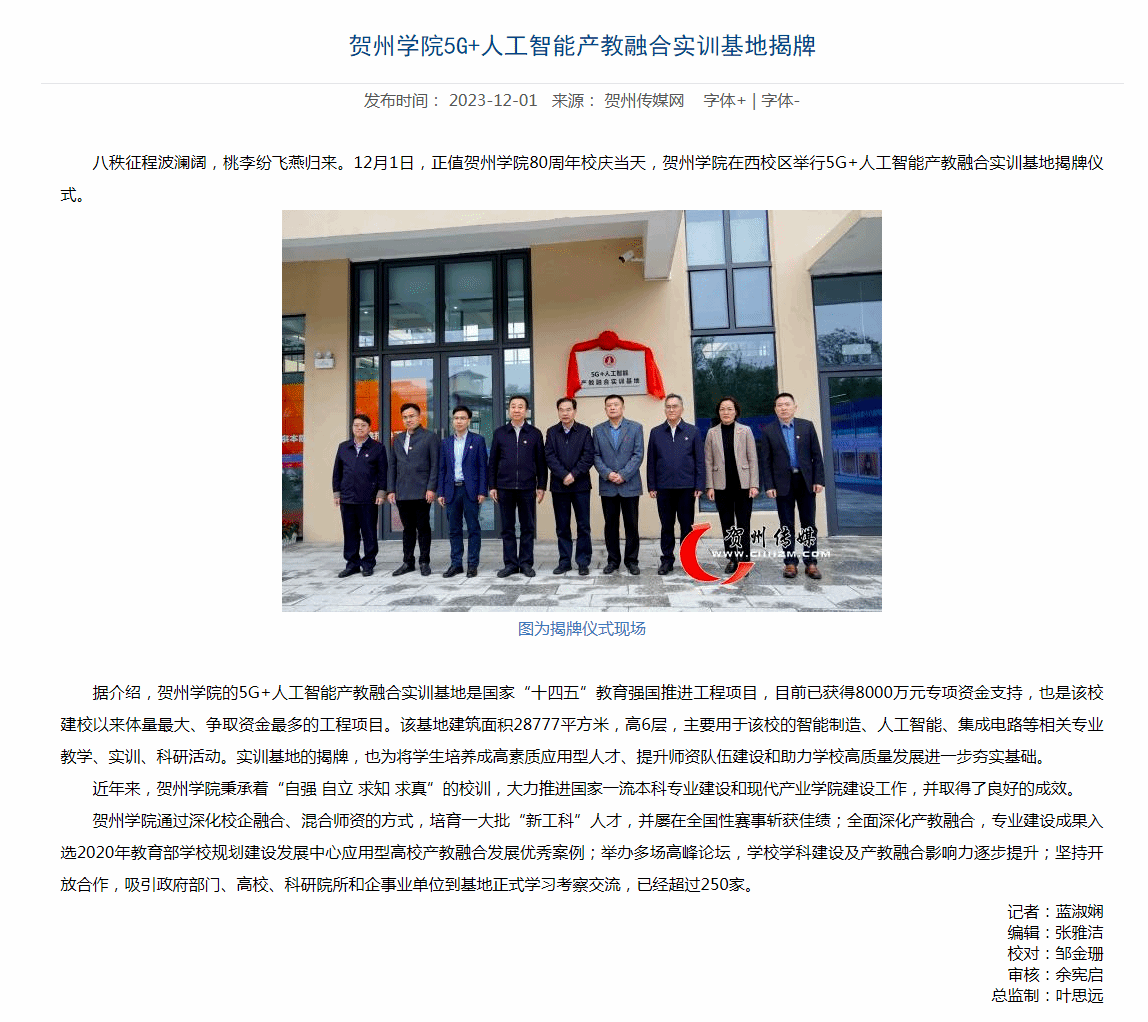 【贺州日报】贺州学院5G+人工智能产教融合实训基地揭牌