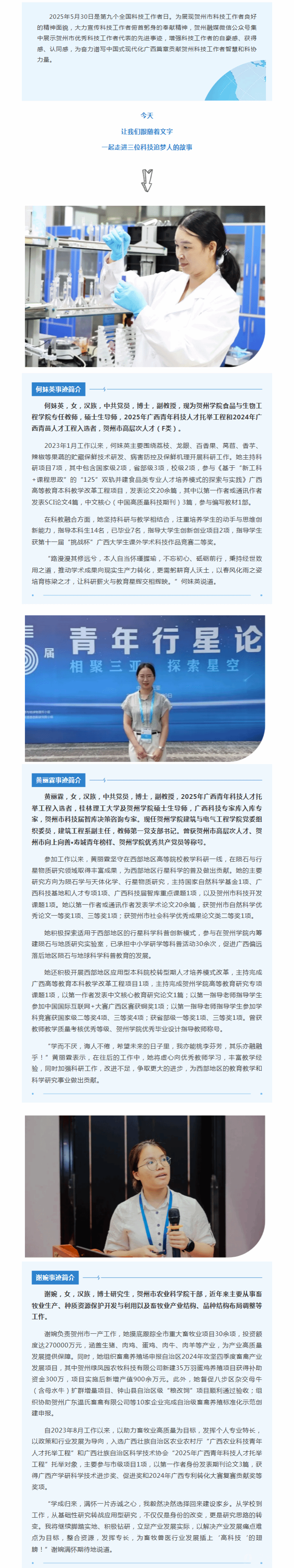 2025年5月30日是第九个全国科技工作者日。为展现贺州市科技工作者良好的精神面貌,大力宣传科技工作者俯首躬身的奉献精神,贺州融媒微信公众号集中展示贺州市优秀科技工作者代表的先进事迹,增强科技工作者的自豪感、获得感、认同感,为奋力谱写中国式现代化广西篇章贡献贺州科技工作者智慧和科协力量。