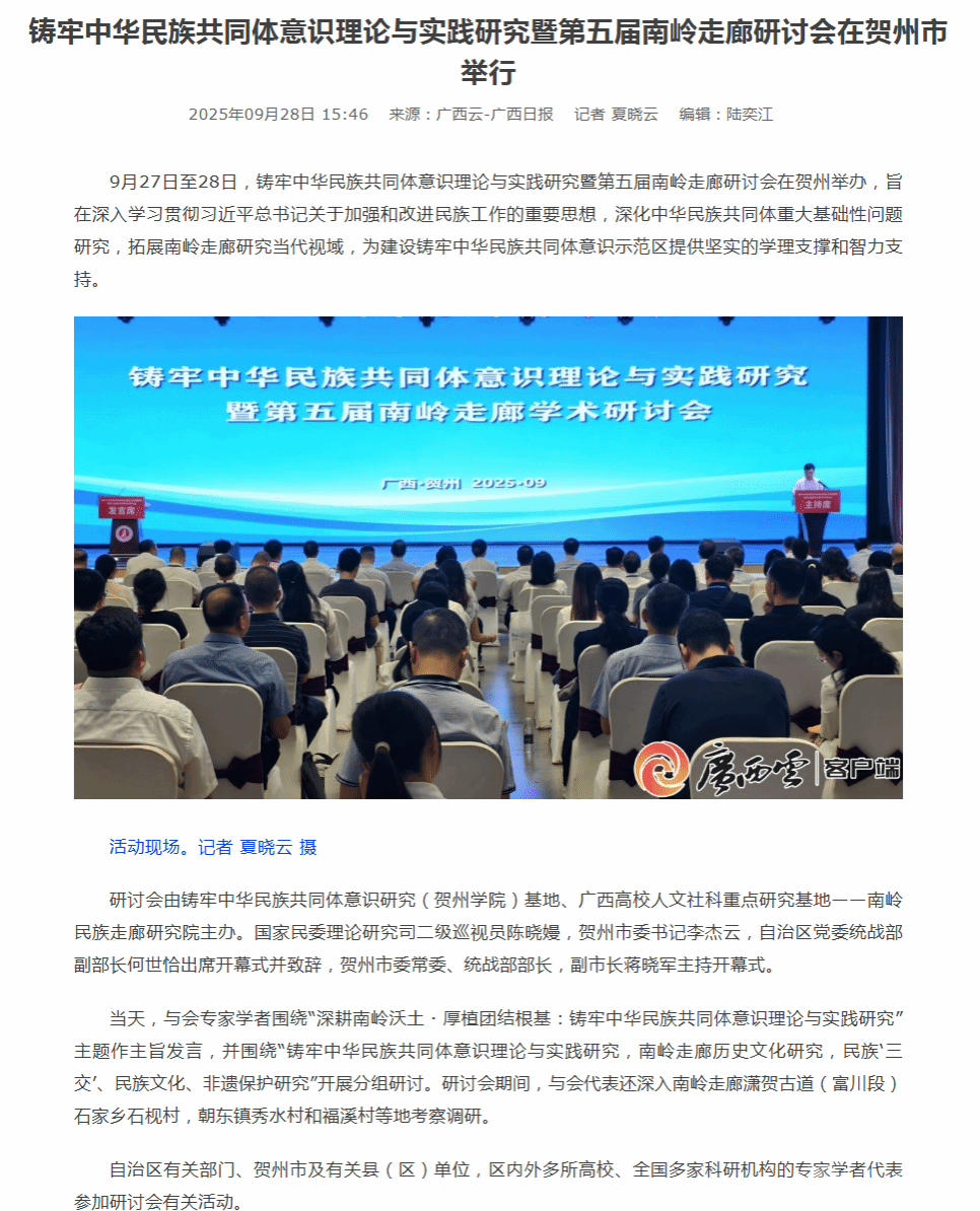 9月27日至28日,铸牢中华民族共同体意识理论与实践研究暨第五届南岭走廊研讨会在贺州举办,旨在深入学习贯彻习近平总书记关于加强和改进民族工作的重要思想,深化中华民族共同体重大基础性问题研究,拓展南岭走廊研究当代视域,为建设铸牢中华民族共同体意识示范区提供坚实的学理支撑和智力支持。