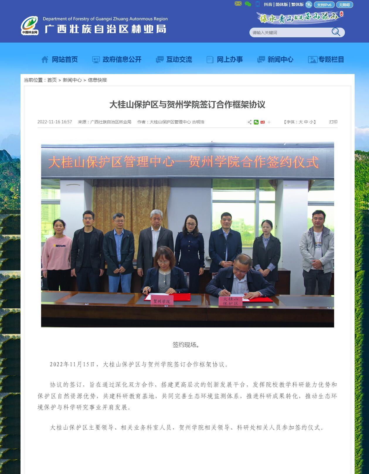 【广西壮族自治区林业局】大桂山保护区与贺州学院签订合作框架协议