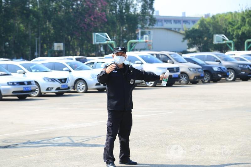 在校园各个路口忙碌着的,是学校的保安工作人员。穿着制服的他们,熟练有序地指挥着来往车辆,同时眼观四路,耳听八方,及时地出现在有需要的地方。虽然天气已入秋,但太阳依旧灼热,他们也顾不上滴落的汗珠。