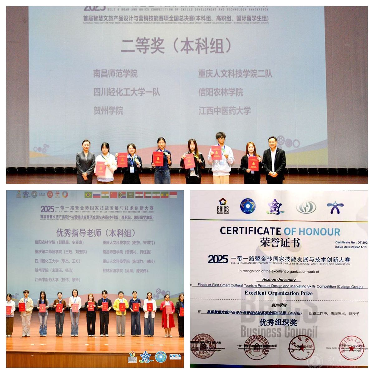 11月13日,备受瞩目的2025“一带一路”暨金砖国家技能发展与技术创新大赛——首届智慧文旅产品设计与营销技能全国总决赛在南宁职业技术大学圆满落幕。我校学生代表队荣获本科组全国二等奖,学校获评“优秀组织奖”,指导教师宋潇玉、杨洁荣获“优秀指导老师”称号。