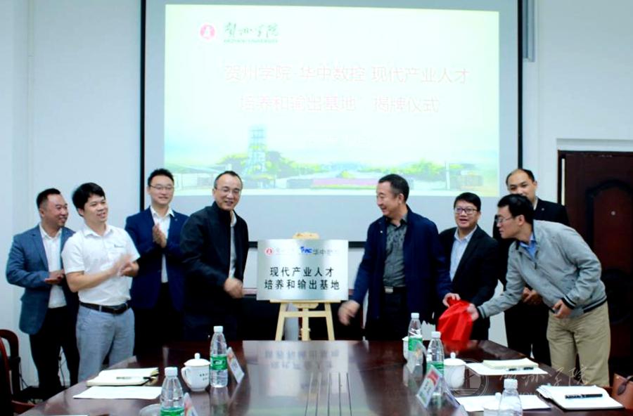 吴郭泉、凌永发、熊清平、莫奕举共同为“工业机器人应用编程职业技能等级证书考核点”“贺州学院—华中数控现代产业人才培养和输出基地”揭牌。凌永发代表学校与武汉华中数控股份有限公司代表签署了“1+X”校企合作意向书。