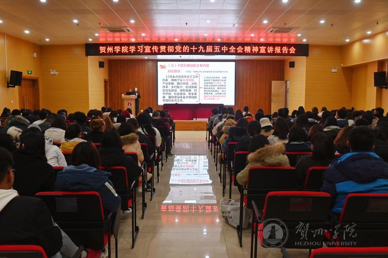 为持续深入学习宣传贯彻党的十九届五中全会精神,12月15日下午,我校分别在地方民族文化研究中心报告厅、逸夫楼111学术报告厅、行政楼多功能厅、创新创业园311多功能厅集中开展党的十九届五中全会精神宣讲,分别由自治区党委讲师团特聘教授、我校马克思主义学院副院长吕途,贺州市委宣讲团成员、我校马克思主义学院党总支书记张百顺、图书馆直属党支部书记吴继寿、科研处副处长吴庆华主讲。