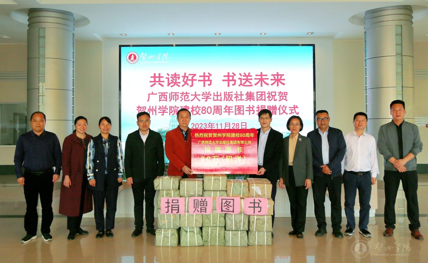 为祝贺我校建校80周年,11月28日,广西师范大学出版社集团、桂林理工大学贺州校友联络处、我校校友先后向学校进行校庆捐赠。学校领导吴郭泉、毛芳才、蒋红星、蒋奕代表学校接受捐赠,对捐赠单位、校友给予学校的关心和支持表示感谢。