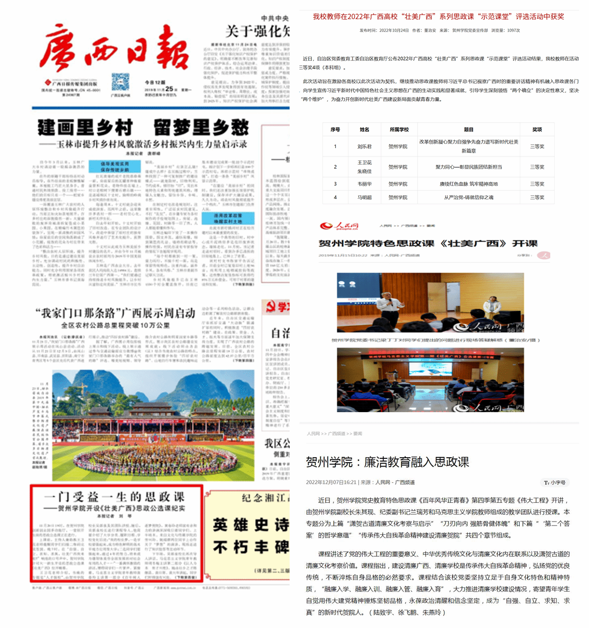 经过持续发展,学院收获了“教学、育人、社会影响、示范推广”等四大成果,在教学成效、育人质量、社会影响与示范推广四个维度实现了显著提升,展现了新时代思想政治工作的强大生命力。教学成果丰硕:构建“8+2”课程群,两门特色公选课开设7季,自编教材13部,设立慕课1门,教师发表论文48篇,获自治区级教改立项13项,荣获各级教学竞赛奖50余项;育人成效显著:学生政治认同和家国情怀显著增强,组建的大学生基层理论宣讲团开展宣讲600余场,惠及3万余各族群众,将思政课堂延伸到广阔天地;同行专家认可:中宣部理论局调研组到校给予肯定,办学特色得到同行专家认可;主流媒体关注:思政金课获《广西日报》头版报道,人民网、光明日报、中国教育报等主流媒体多次报道课程建设,“壮美广西”等课程成为地方高校思政课改革的亮眼名片。