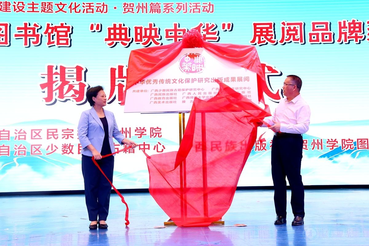 自治区民宗委党组成员、副主任邓娟娟,贺州市委常委、统战部部长、副市长蒋晓军,我校党委常委、副校长朱其现等领导出席启动仪式并讲话。邓娟娟宣布中华民族共有精神家园建设主题文化活动·贺州篇启动;邓娟娟与朱其现共同为贺州学院“典映中华”展阅品牌建设点揭牌。