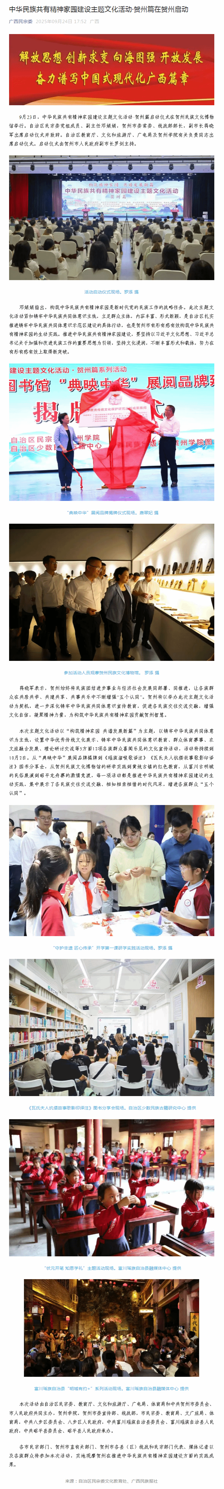 9月23日,中华民族共有精神家园建设主题文化活动·贺州篇启动仪式在贺州民族文化博物馆举行。自治区民宗委党组成员、副主任邓娟娟,贺州市委常委、统战部部长,副市长蒋晓军出席启动仪式并致辞。自治区教育厅、文化和旅游厅、广电局及贺州学院有关负责同志出席启动仪式。启动仪式由贺州市人民政府副市长罗剑主持。