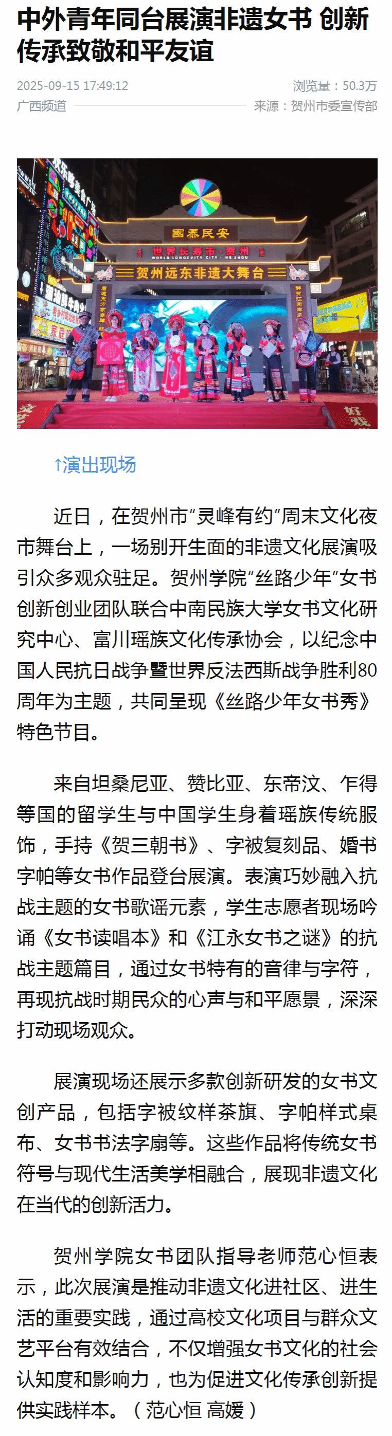 贺州学院女书团队指导老师范心恒表示,此次展演是推动非遗文化进社区、进生活的重要实践,通过高校文化项目与群众文艺平台有效结合,不仅增强女书文化的社会认知度和影响力,也为促进文化传承创新提供实践样本。(范心恒 高媛)