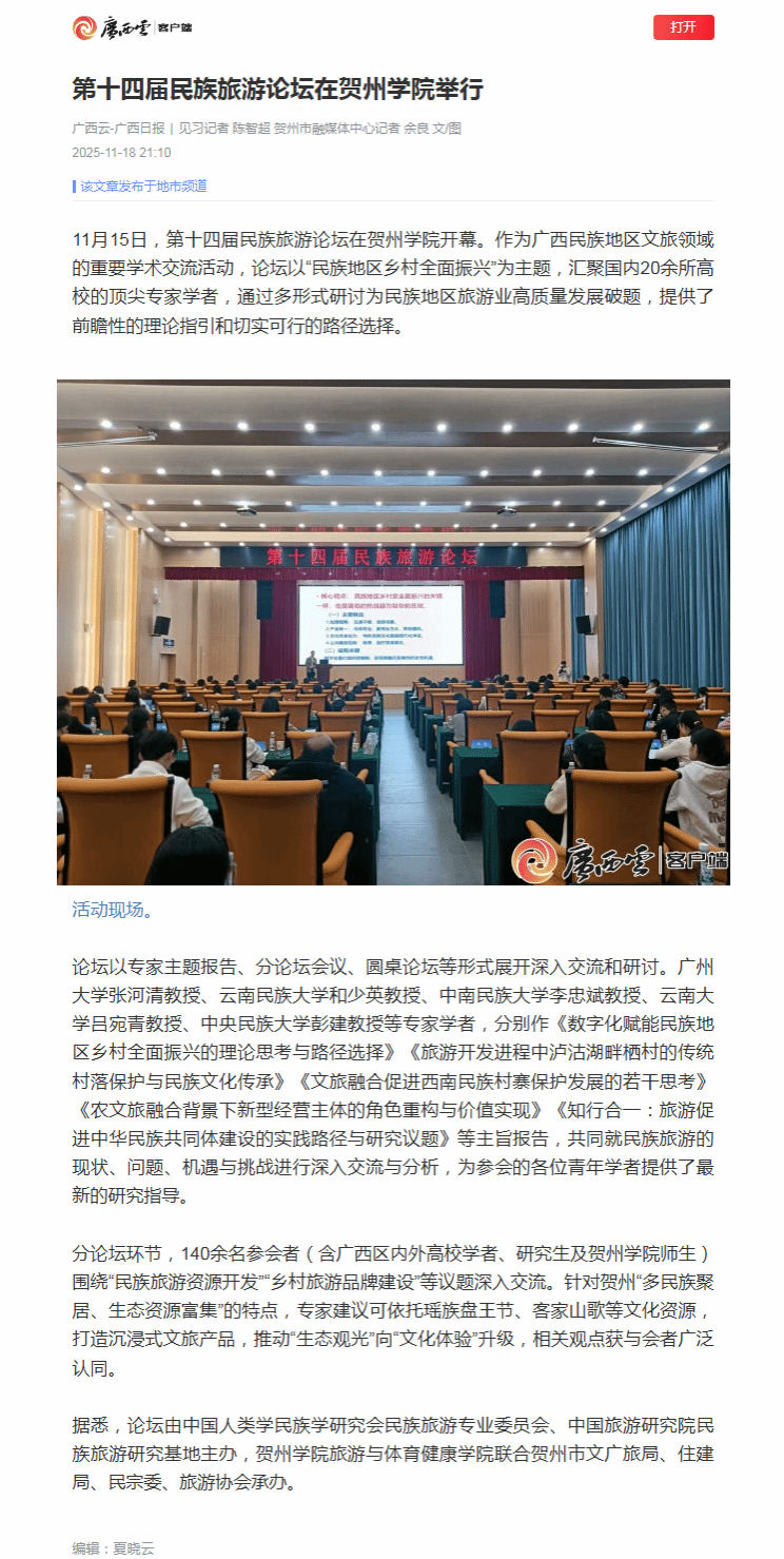 11月15日,第十四届民族旅游论坛在贺州学院开幕。作为广西民族地区文旅领域的重要学术交流活动,论坛以“民族地区乡村全面振兴”为主题,汇聚国内20余所高校的顶尖专家学者,通过多形式研讨为民族地区旅游业高质量发展破题,提供了前瞻性的理论指引和切实可行的路径选择。