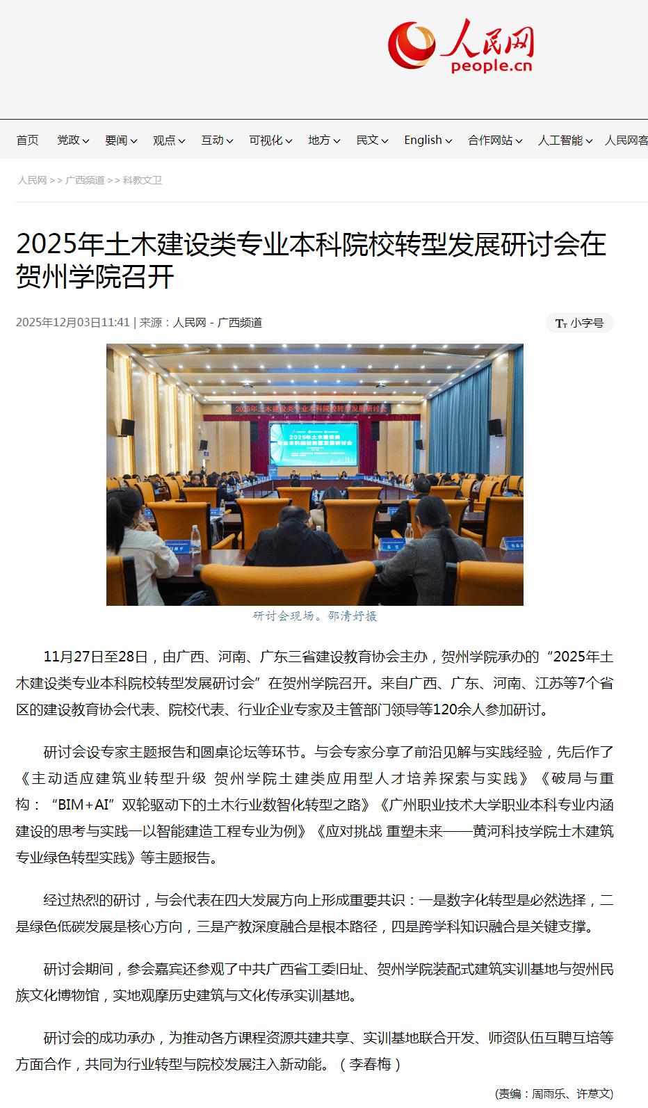 11月27日至28日,由广西、河南、广东三省建设教育协会主办,贺州学院承办的“2025年土木建设类专业本科院校转型发展研讨会”在贺州学院召开。来自广西、广东、河南、江苏等7个省区的建设教育协会代表、院校代表、行业企业专家及主管部门领导等120余人参加研讨。