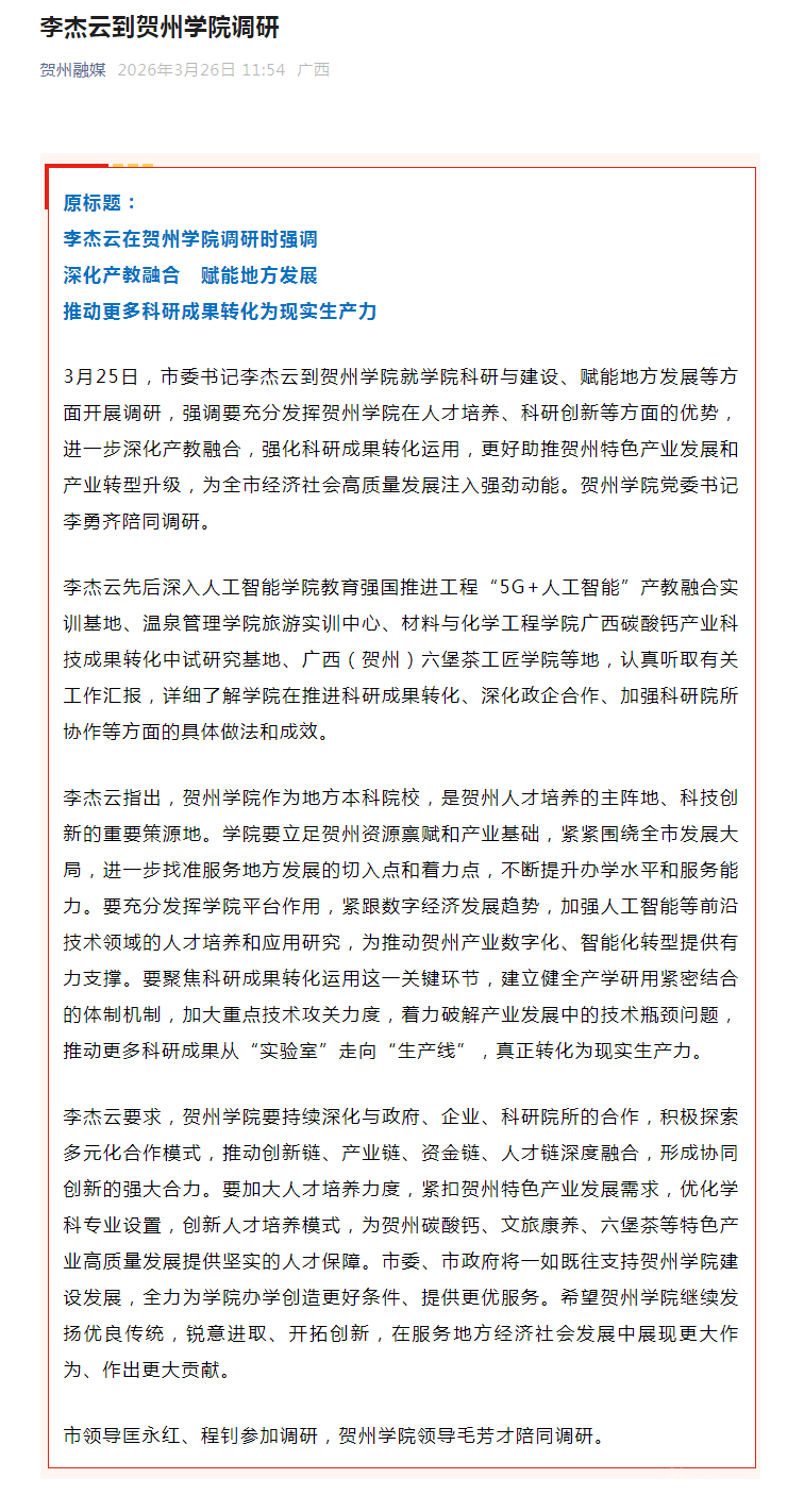 李杰云指出,贺州学院作为地方本科院校,是贺州人才培养的主阵地、科技创新的重要策源地。学院要立足贺州资源禀赋和产业基础,紧紧围绕全市发展大局,进一步找准服务地方发展的切入点和着力点,不断提升办学水平和服务能力。要充分发挥学院平台作用,紧跟数字经济发展趋势,加强人工智能等前沿技术领域的人才培养和应用研究,为推动贺州产业数字化、智能化转型提供有力支撑。要聚焦科研成果转化运用这一关键环节,建立健全产学研用紧密结合的体制机制,加大重点技术攻关力度,着力破解产业发展中的技术瓶颈问题,推动更多科研成果从“实验室”走向“生产线”,真正转化为现实生产力。