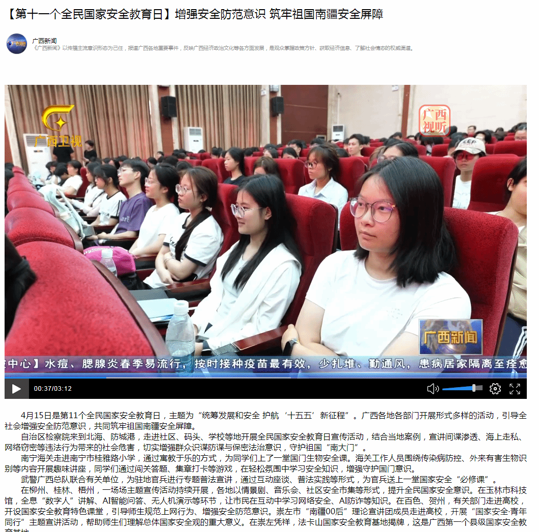 在柳州、桂林、梧州,一场场主题宣传活动持续开展,各地以情景剧、音乐会、社区安全市集等形式,提升全民国家安全意识。在玉林市科技馆,全息“数字人”讲解、AI智能问答、无人机演示等环节,让市民在互动中学习网络安全、AI防诈等知识。在百色、贺州,有关部门走进高校,开设国家安全教育特色课堂,引导师生规范上网行为、增强安全防范意识。崇左市“南疆00后”理论宣讲团成员走进高校,开展“国家安全·青年同行”主题宣讲活动,帮助师生们理解总体国家安全观的重大意义。在崇左凭祥,法卡山国家安全教育基地揭牌,这是广西第一个县级国家安全教育基地。