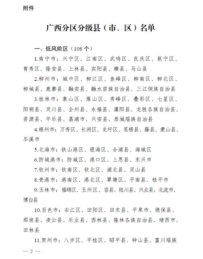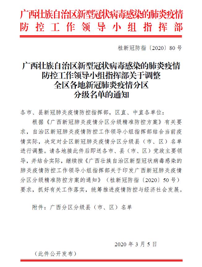 桂新冠防指〔2020〕80号:关于调整全区各地新冠肺炎疫情分区分级名单的通知