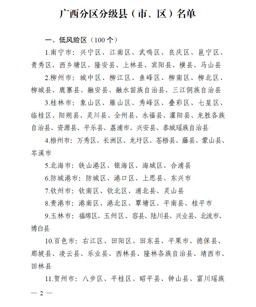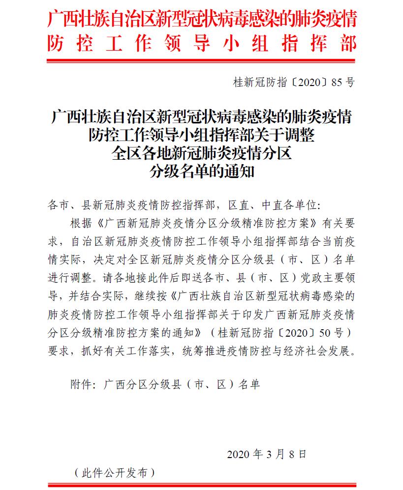 桂新冠防指〔2020〕85号:关于调整全区各地新冠肺炎疫情分区分级名单的通知