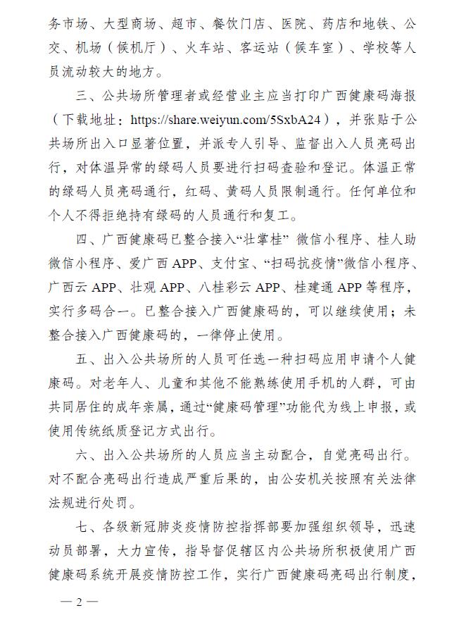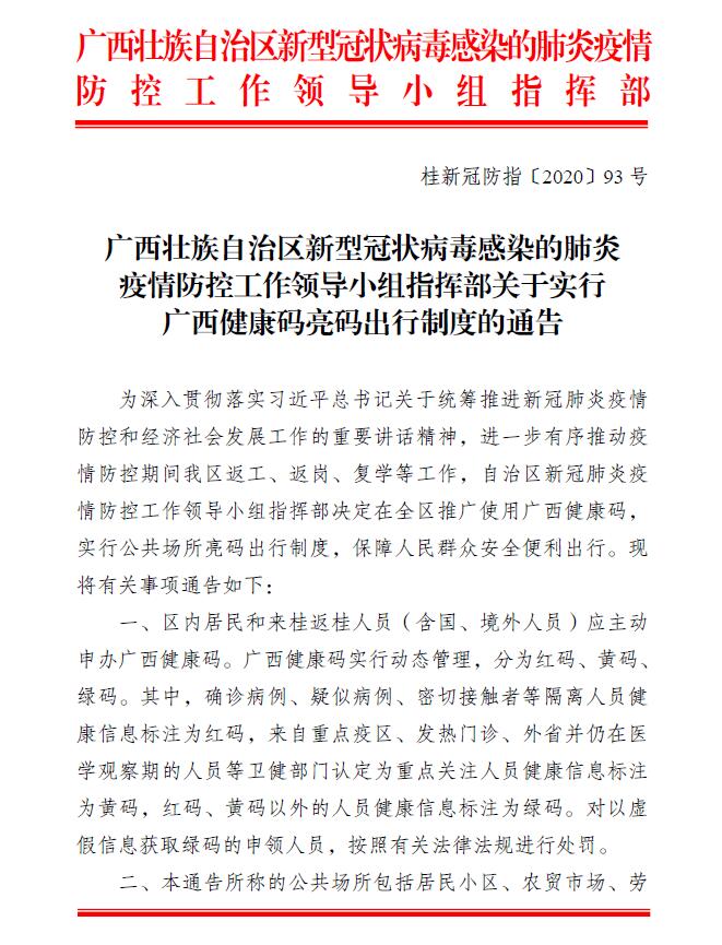 桂新冠防指〔2020〕93号:关于实行广西健康码亮码出行制度的通告