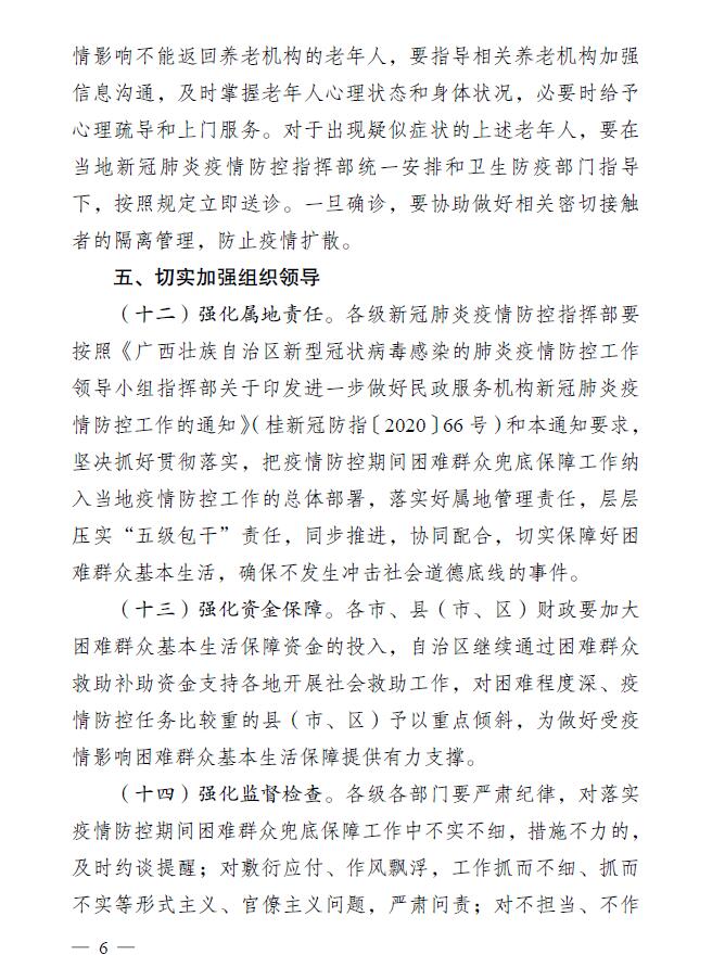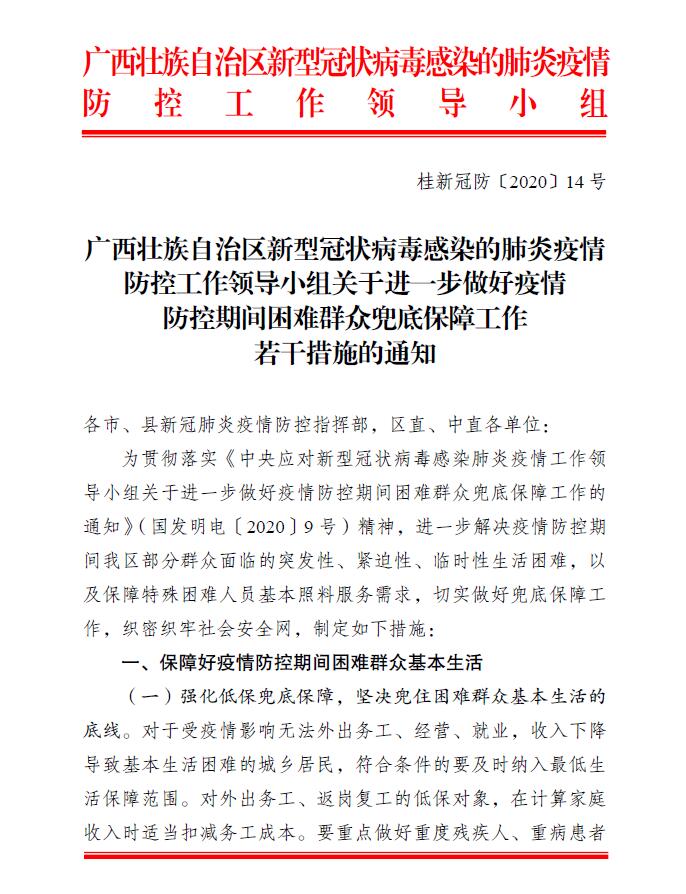 桂新冠防〔2020〕14号:关于进一步做好疫情防控期间困难群众兜底保障工作若干措施的通知