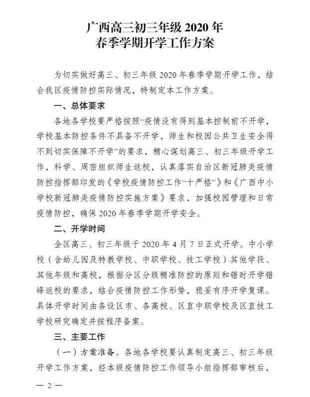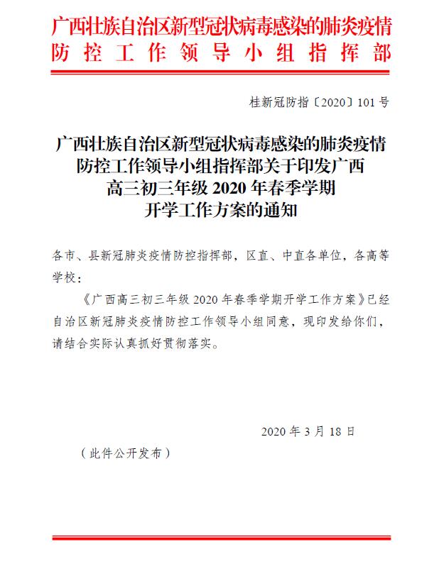 桂新冠防指〔2020〕101号:关于印发广西高三、初三年级2020年春季学期开学工作方案的通知