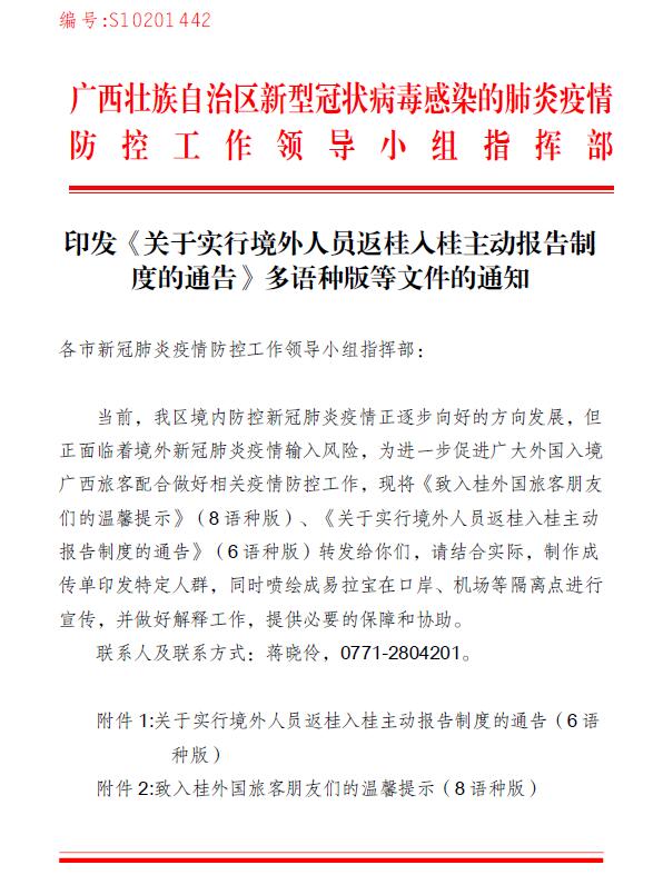 印发《关于实行境外人员返桂入桂主动报告制度的通告》多语种版等文件的通知