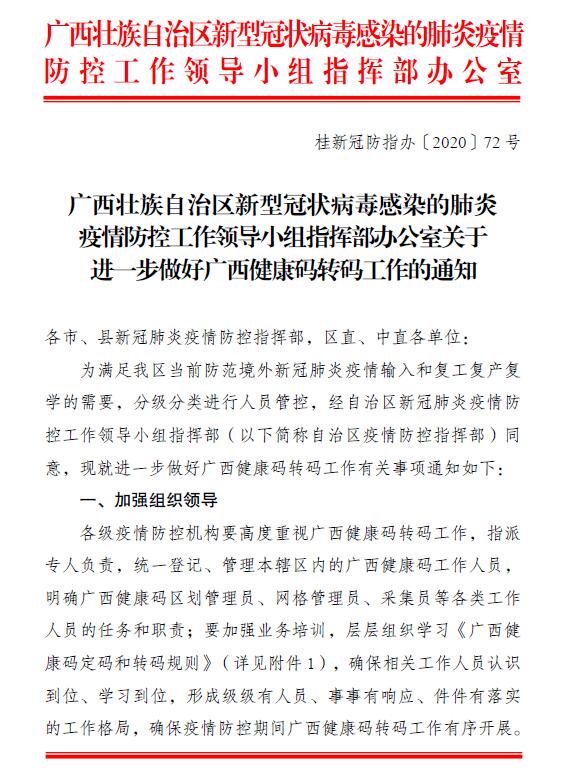 桂新冠防指办〔2020〕72 号:关于进一步做好广西健康码转码工作的通知