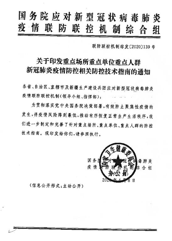 联防联控机制综发〔2020〕139号:关于印发重点场所重点单位重点人群新冠肺炎疫情防控相关防控技术指南的通知