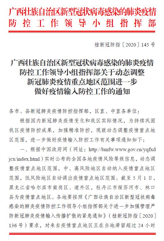 桂新冠防指〔2020〕145号:关于动态调整新冠肺炎疫情重点地区范围进一步做好疫情输入防控工作的通知