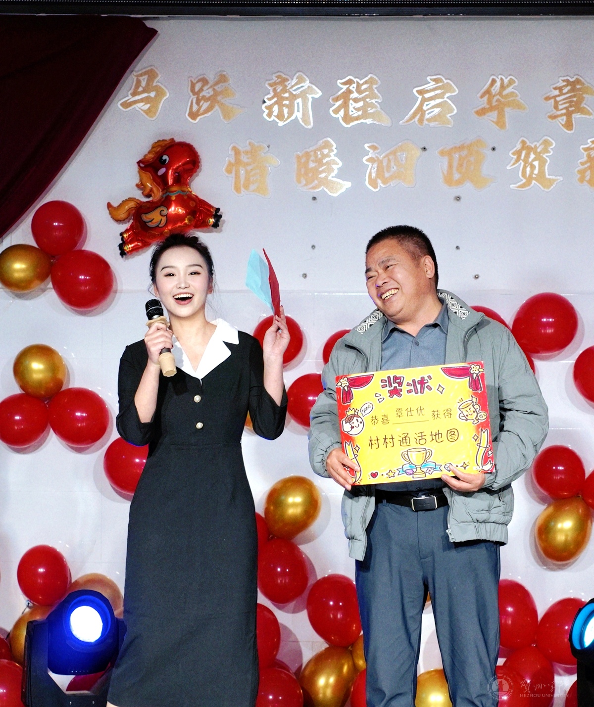 图为严宇田(左)发挥专业特长在服务地主持晚会